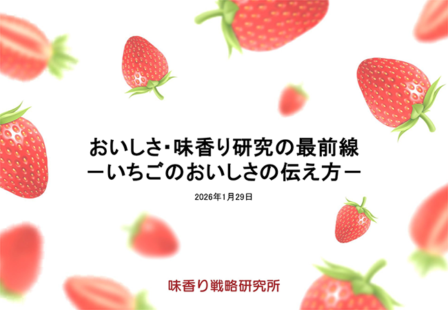 いちごの「おいしさの伝え方」を主題にした講演では、まず「おいしさとは」として、おいしさを構成する要素を紹介。各感覚に対応した分析技術を解説しました。いちご以外も含めた分析技術・データの活用事例、生鮮食品の味の見える化といった具体的な事例も共有しながら、料理への活用など味香り戦略研究所ならではのいちごのおいしい食べ方提案もお伝えしました。