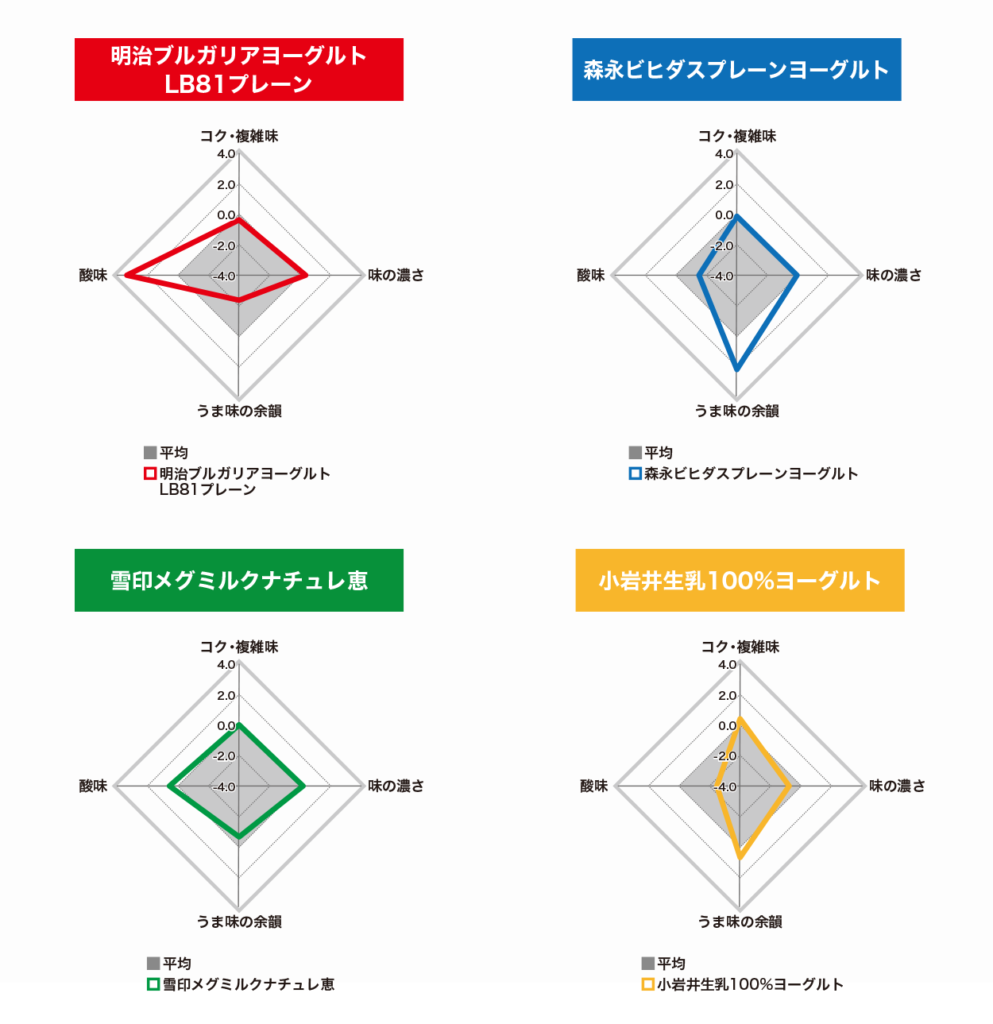 今回の分析では、4社のプレーンヨーグルト(明治ブルガリアヨーグルトLB81プレーン、森永ビヒダスプレーンヨーグルト、雪印メグミルクナチュレ恵、小岩井生乳100%ヨーグルト)を対象に検証を行いました。
