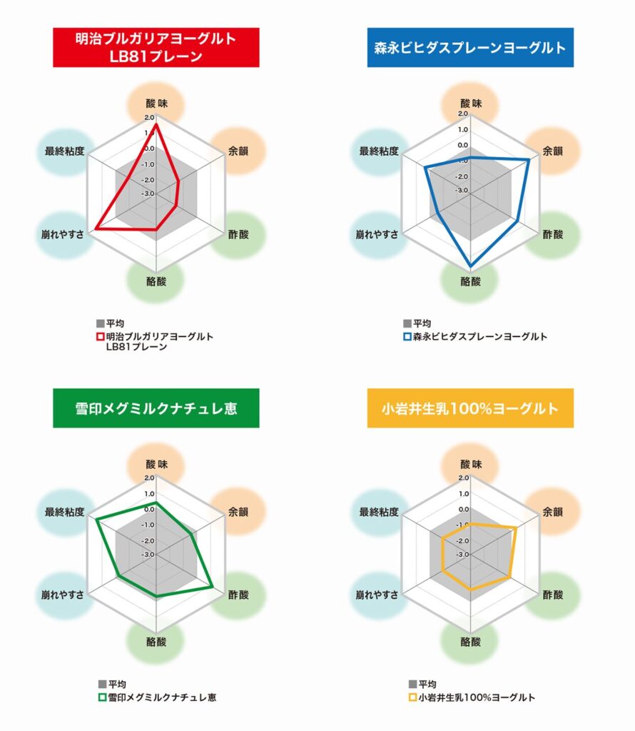 〈明治ブルガリアヨーグルトLB81プレーン〉味としての酸味は強い一方、酸や発酵由来のにおいは控えめで、味とにおいが互いに補完し合うことで風味のバランスがとれている。さらに、構造の崩壊が速いため、口中での味の滞留時間が短く、結果として「すっきりした後味」として認識されると考えられる