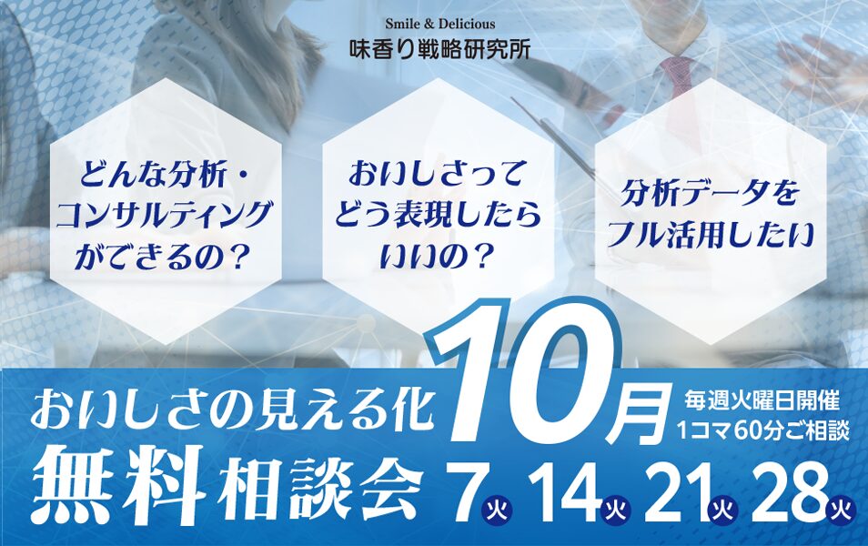 本相談会では、個別の課題に応じた分析・データ活用を味香り戦略研究所コンサルタントが具体的にご提案します。お申し込みフォームにてご入力いただいた内容に沿って、提案書・お見積り、参考事例をご用意。御社のためにご用意した資料はそのままお持ち帰りいただけます。