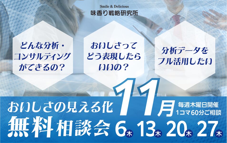 本相談会では、個別の課題に応じた分析・データ活用を味香り戦略研究所コンサルタントが具体的にご提案します。お申し込みフォームにてご入力いただいた内容に沿って、提案書・お見積り、参考事例をご用意。御社のためにご用意した資料はそのままお持ち帰りいただけます。